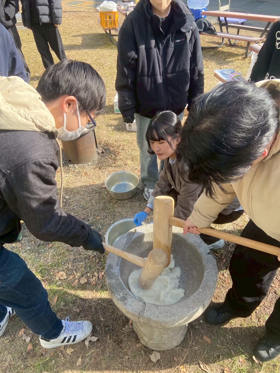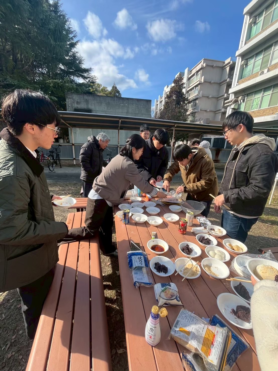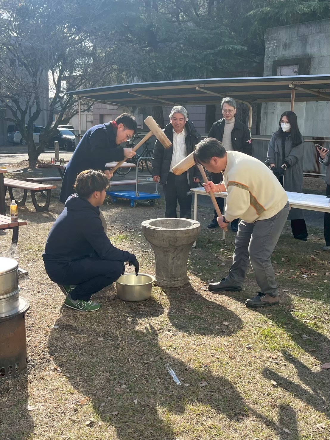 毎年恒例の研究室餅つき大会を行いました。餅つきと豚汁作りで冷えた体を温めることができました。今年は本間研究室のOBの方にも参加していただき、交流を深める良い機会となりました。